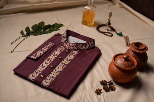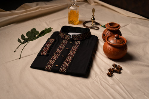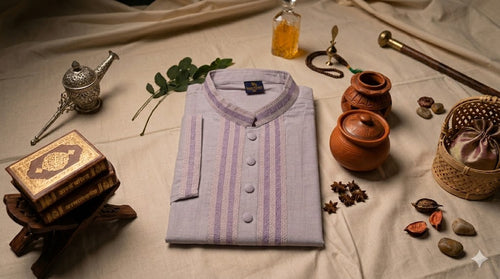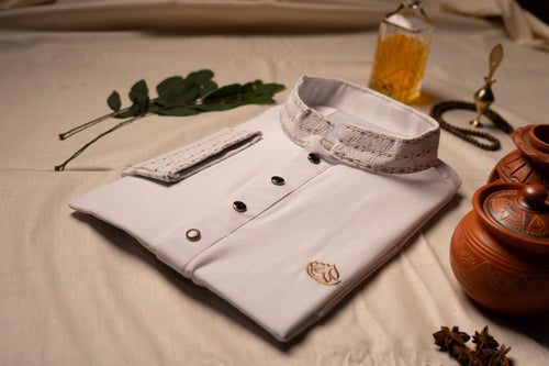 Add a refreshing touch to your wardrobe with this elegant light sage green Panjabi. It features finely detailed, tonal green geometric embroidery along the mandarin collar and front placket for a clean and sophisticated aesthetic. Finished with ornate decorative buttons, this polished piece is a wonderful choice for both daytime celebrations and formal cultural gatherings. Price: $45 | SKU: C104